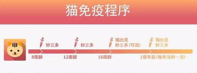 一般情况下猫咪在8周也就是大概2-3月大小的时候可以带猫咪去接种第一针猫三联疫苗,然后在12周大,也就是在一到两个月后,再给猫咪接种第二针疫苗,前面两针是必须要打的,具体的间隔在一两月都是可控的。下面给大家介绍下硕腾官方的给出的猫咪接种疫苗的时间图,供大家参考。