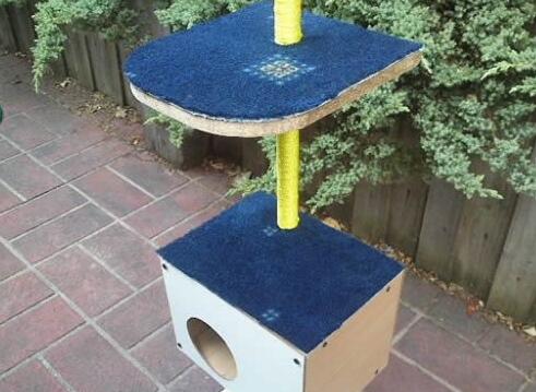 步骤:这个设计主要由一根金属管子为中心,除了底板,还有一个小房子和一块平台。废料-切割板块-落好料的板块-先组装好“小房子”,钻一个和圆柱一样大小的洞-为了增加牢度,在板材上加一个固定木块-组装完毕-在两个平面上裁剪两块废旧地毯,用胶粘贴-2块钱买一卷塑料绳(最好是麻绳)整齐绕在铁杆上-“小房子”两面都有圆孔。